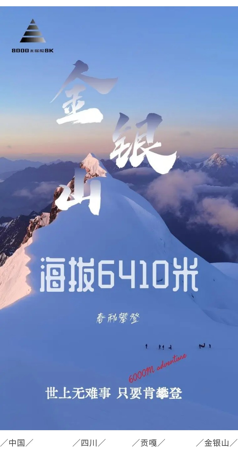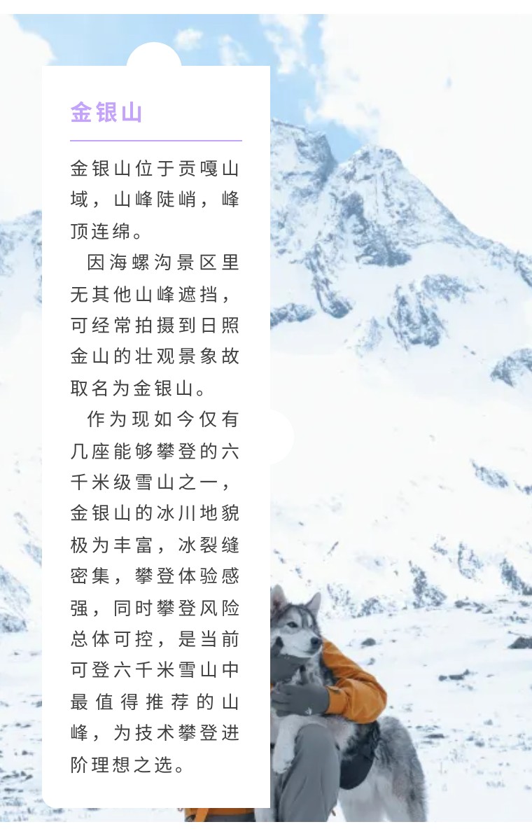 金银山作为难度较高的6千米级技术型雪山有着美轮美奂的风景,C1 至顶峰全部由冰川覆盖,线路陡峭,冰裂缝纵横密布,攀登者需要面临低温、落石落冰、雪崩、滑坠及掉裂缝的危险,在保证安全的前提下体验到技术型雪山独有的惊险和刺激。