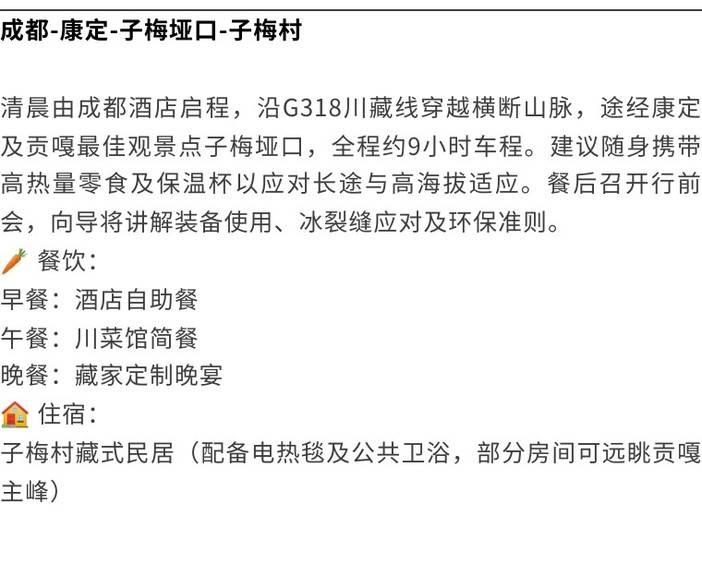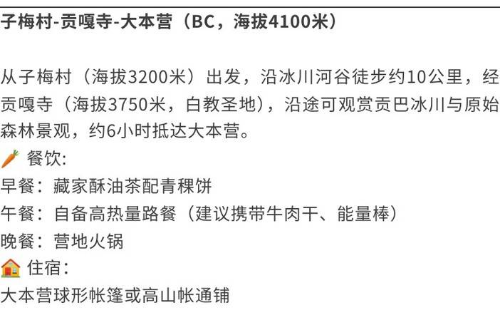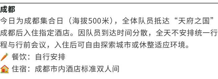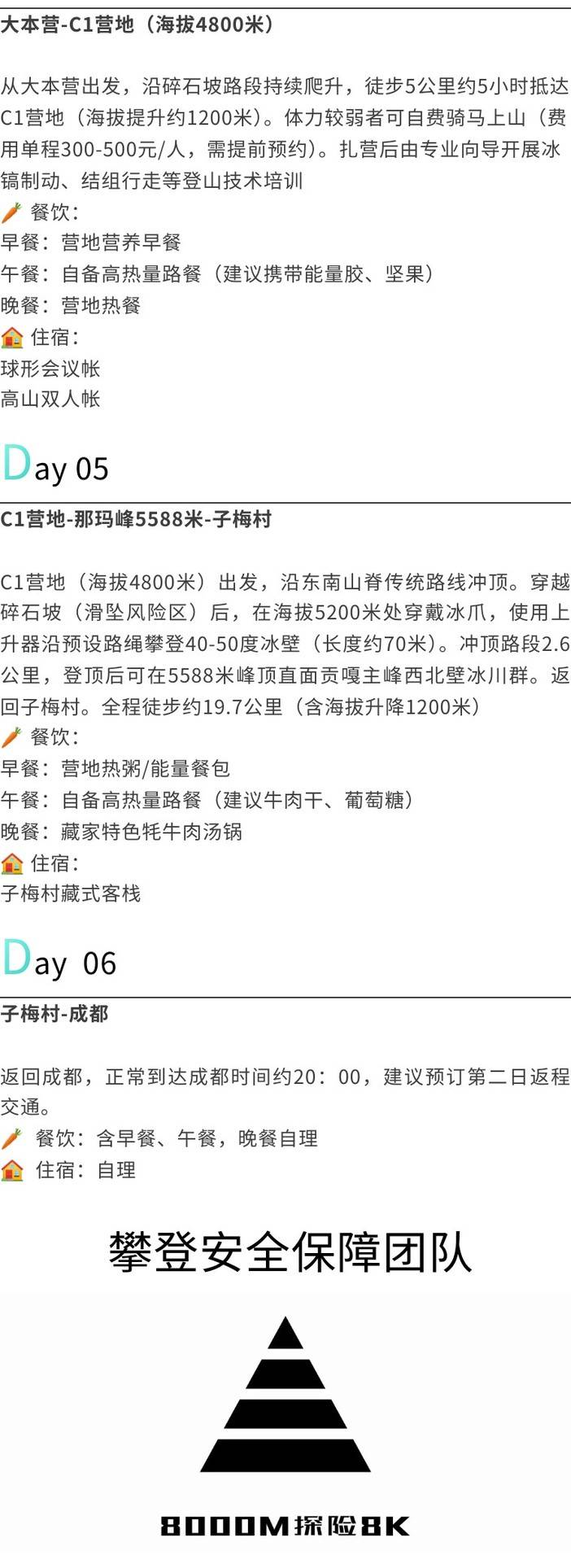 ☑住宿费(第0天成都集合2人/间,单人房差150元,子梅村2晚、大本营大帐篷1晚2人帐、C1营地帐篷1晚2人帐)