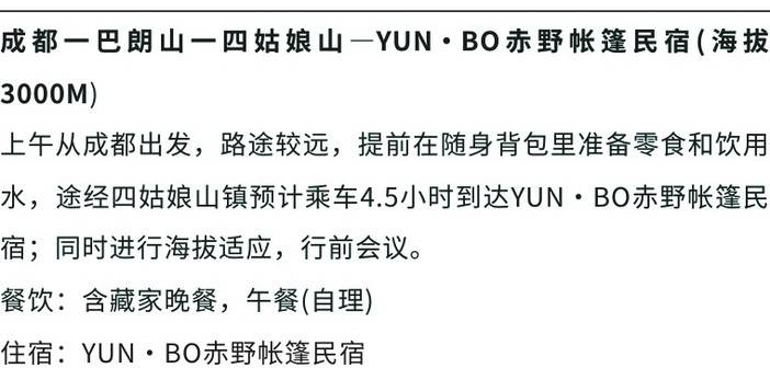 营地保障:全程轻装、提供营地睡袋、高标餐食、烧烤、水果